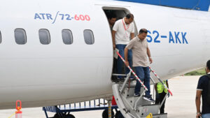 যশোর বিমানবন্দরে প্রধানমন্ত্রীকে স্বাগত জানান বিদ্যুৎ, জ্বালানি ও খনিজ সম্পদ মন্ত্রণালয়ের প্রতিমন্ত্রী অনিন্দ্য ইসলাম অমিত এবং বিএনপির ভাইস চেয়ারম্যান নার্গিস বেগম।